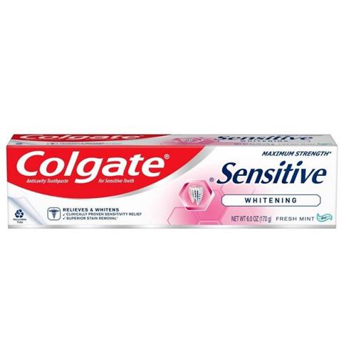 Colgate Sensitive Whitening toothpaste provides 24/7 sensitivity protection with twice-daily brushing. This sensitive teeth toothpaste contains potassium nitrate, clinically proven to soothe the nerves in exposed dentin. With regular use, it provides long-lasting sensitivity relief and removes surface stains to help keep teeth whiter and brighter (with regular brushing vs. non-whitening toothpaste). Plus Colgate Sensitive Whitening toothpaste helps repair weakened enamel, protect teeth from cavities and provides the freshness you trust from Colgate.