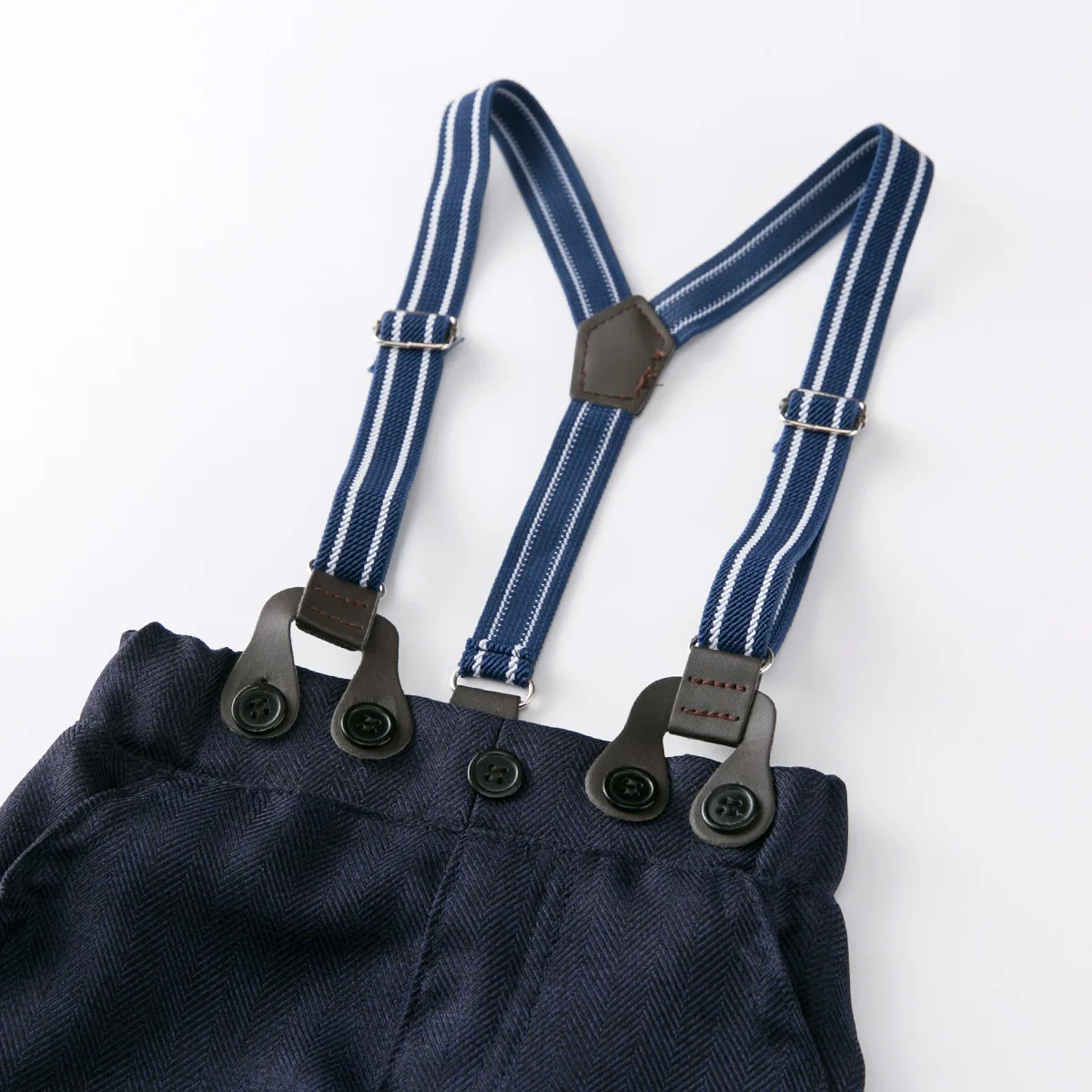 This boy dinosaur suspender set with adorable bow tie and braces details will be the favorite outfit for true dino fans. This set features a long-sleeved romper with a dinosaur print design, a detachable bow tie with an elastic strap, and navy blue pants. It is the perfect smart-casual set in the baby's wardrobe this season.