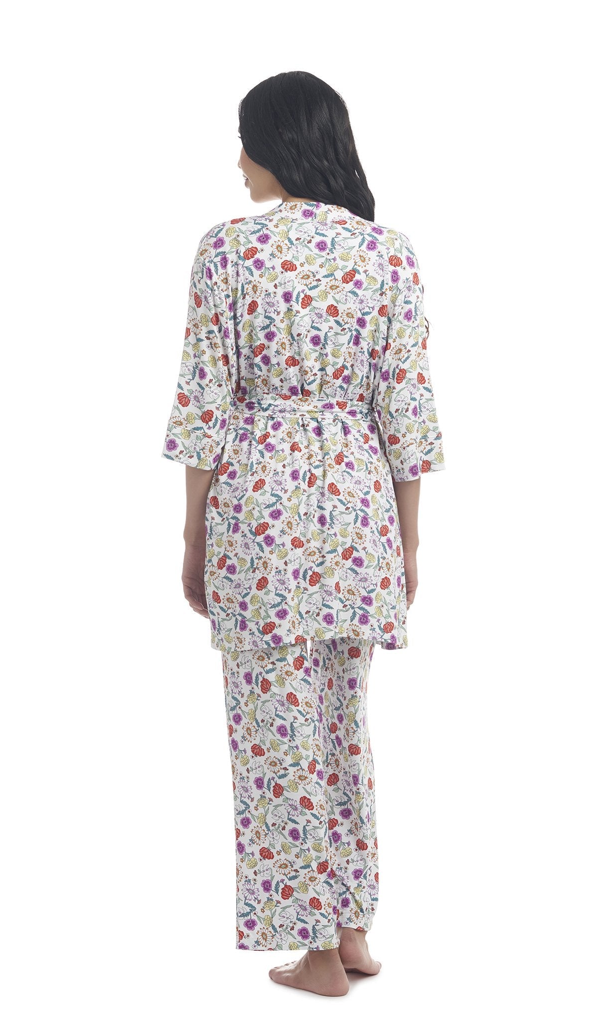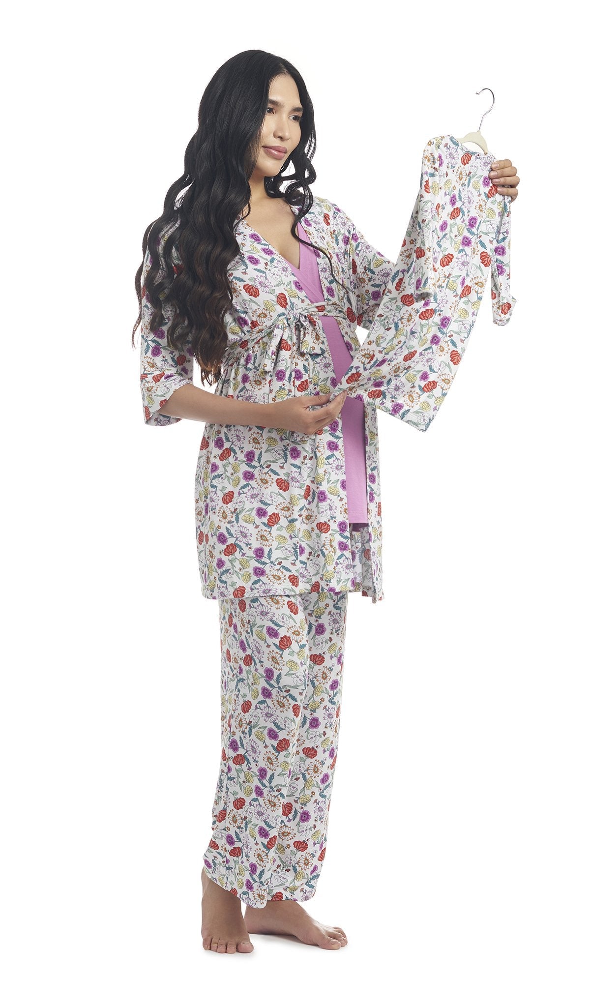 - Set includes maternity/nursing top, pant, robe, newborn gown (0-3M) and matching drawstring gift bag.