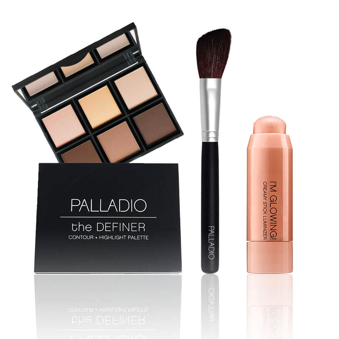 Featuring The Definer Contour + Highlight Palette, I'm Glowing Creamy Luminizer Stick in VIP, and an Angled Blush Brush for flawless application.