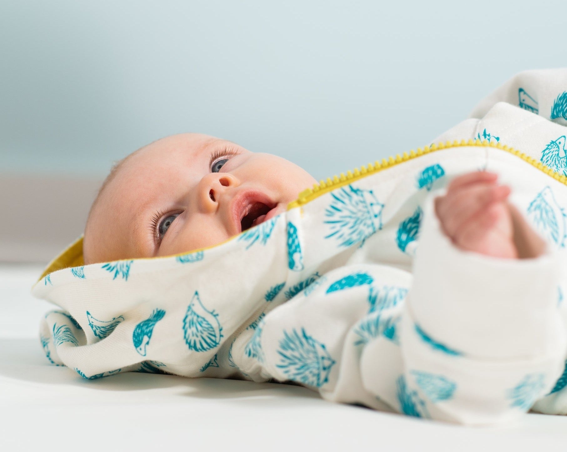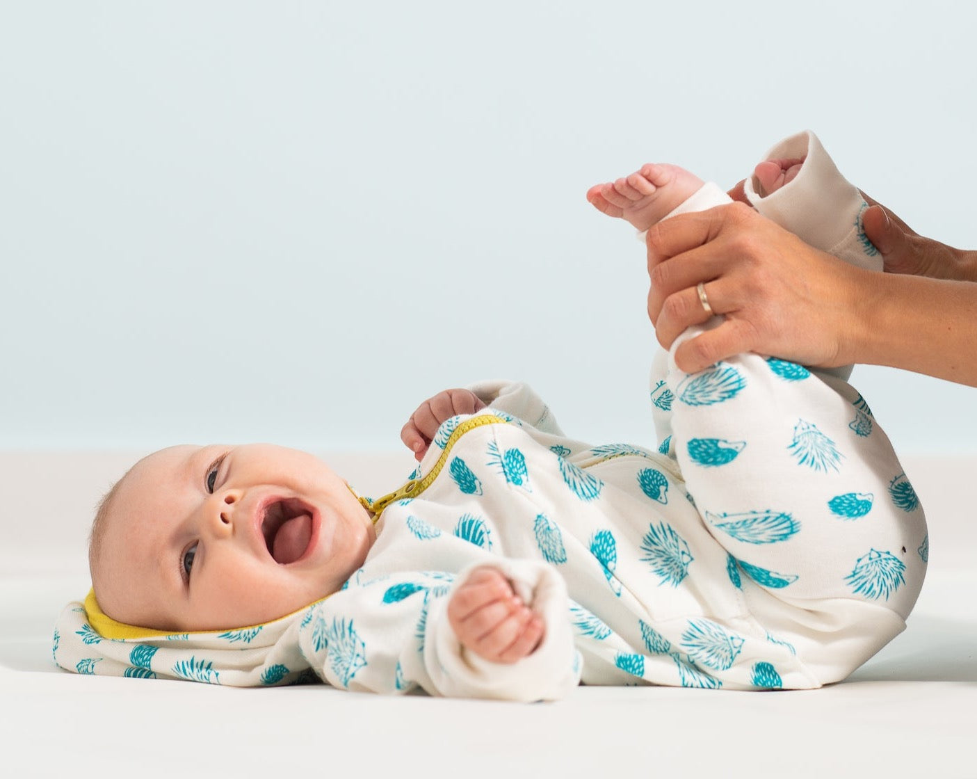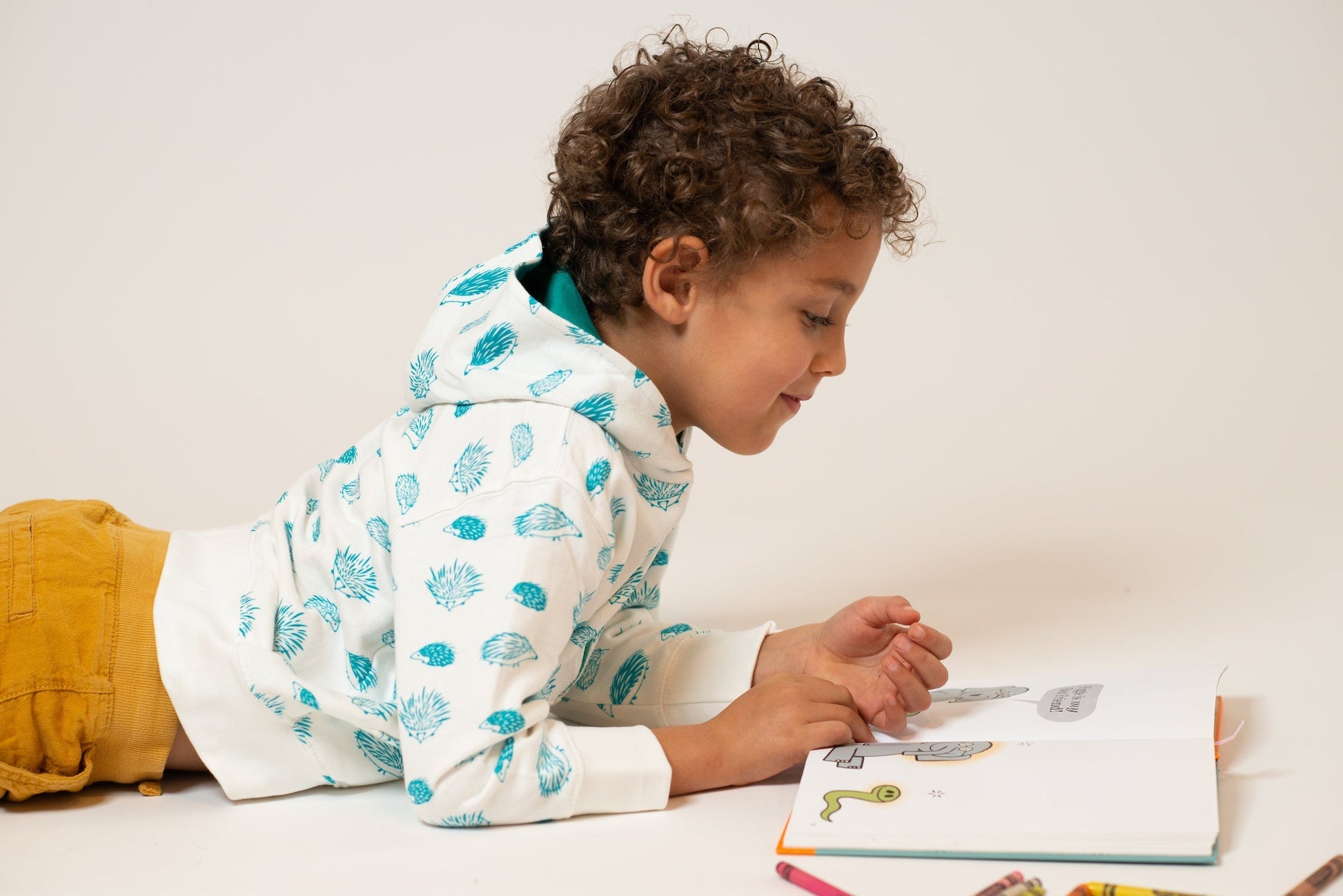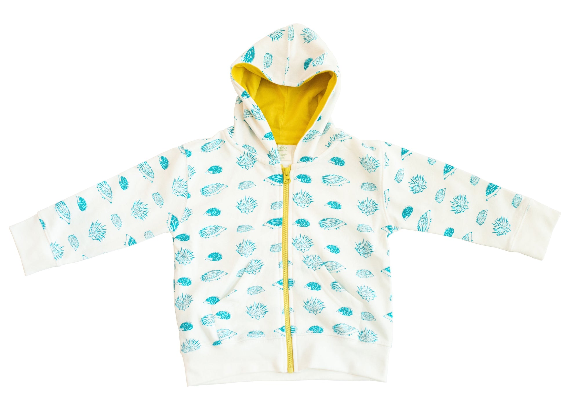 The Baby Porcupine Hoodie has two pockets in the front- plus a contrasting celery zipper and hood lining. Mirasa hoodies are generously sized, stretching out the fun to last more than just a couple of months.