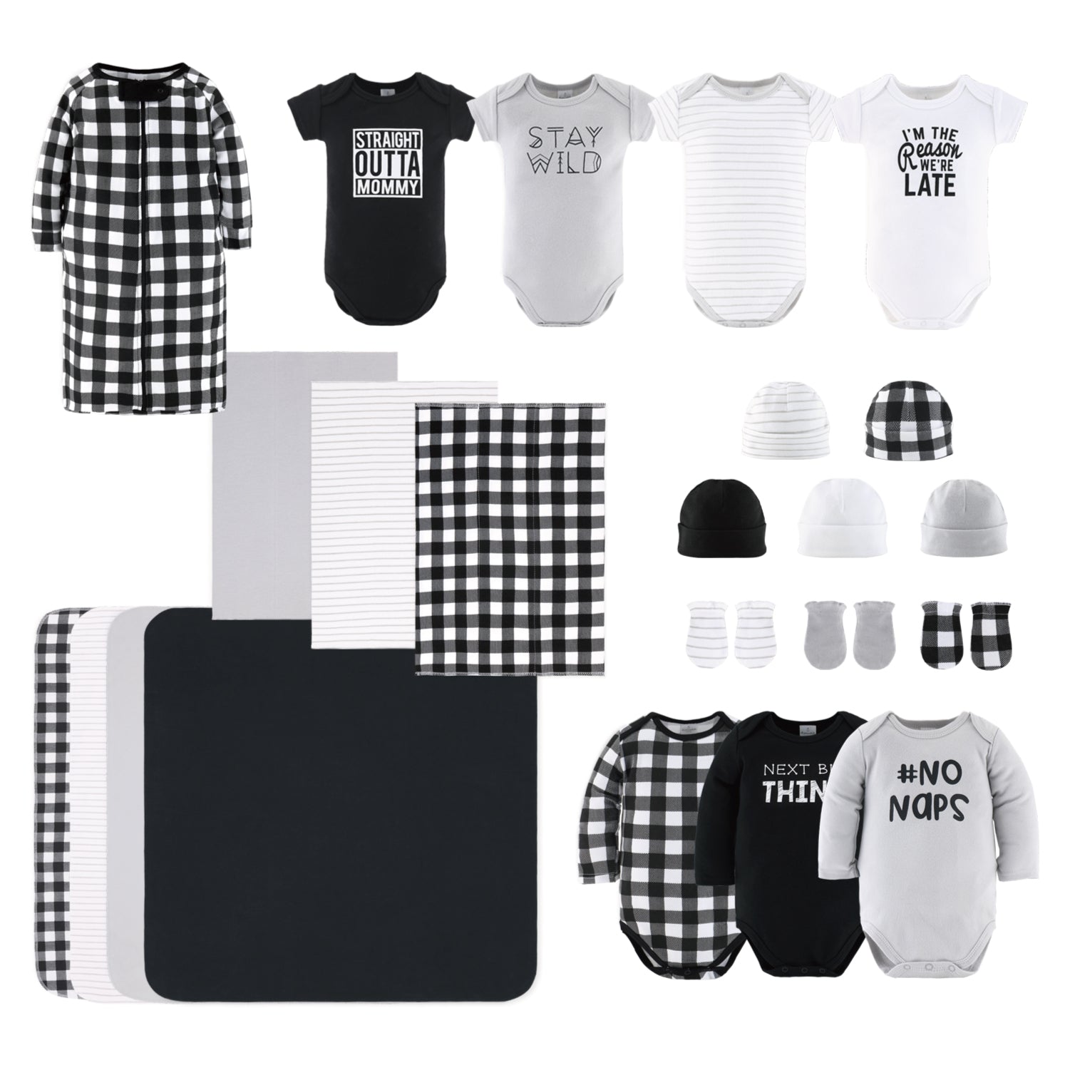 Combining a variety of designs and styles, this 23-Piece Layette Set from The Peanut shell is a perfect assortment for your newborn. Printed on soft cotton knit, these pieces are comfy and cozy. The modern black and white buffalo plaid, grey and white stripe, and solid colour pieces coordinate so your little one will always look perfectly pulled together. Screen printed bodysuits feature fun sayings for extra appeal. Coming with everything from bodysuits to burp cloths, this collection is sure to come in handy!