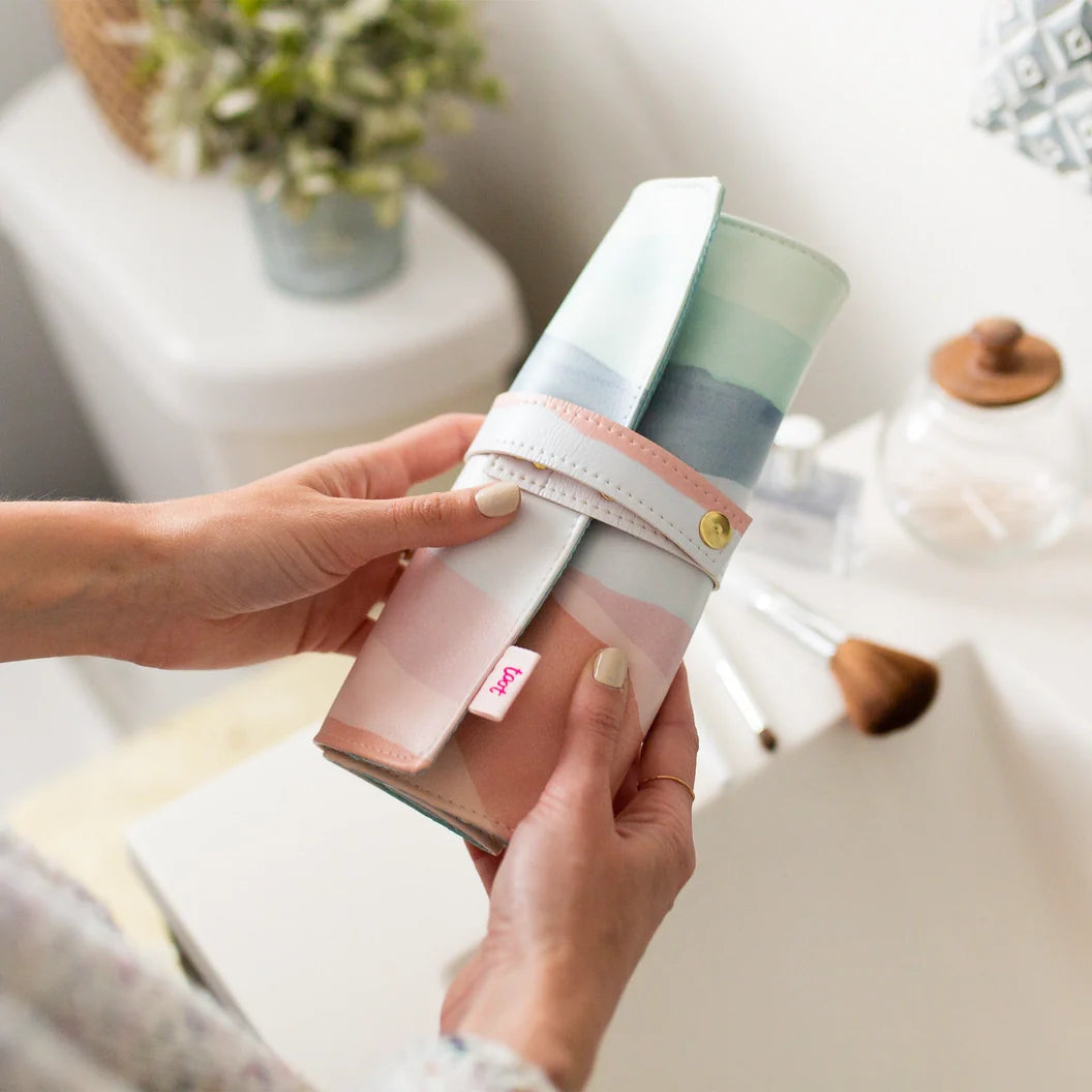 Our VEGAN LEATHER ROLL UP MAKEUP BAG is the perfect makeup brush organizer. Keep them nice & neatly rolled up & ready to go at a moment's notice. Featuring a zip pouch & snap button closure pouch for extra storage.