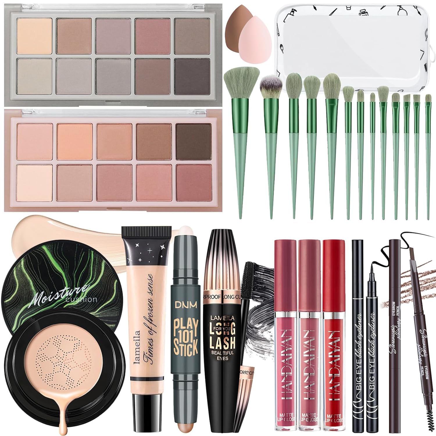 [All In One Makeup Kit] The Christmas makeup gift set for girl includes 2 × 10 colors shimmer & matte eyeshadow palette, full coverage natural foundation, natural mushroom head air cushion cc cream, 3pcs lip gloss, dual-ended counter stick, eyeliner, dual-ended eyebrow pencil, waterproof mascara, 13pcs makeup brushes, 2pcs makeup sponges & waterproof cosmetic bag. It can meet all the beginners’ or professional makeup artists’ needs for daily makeup.
